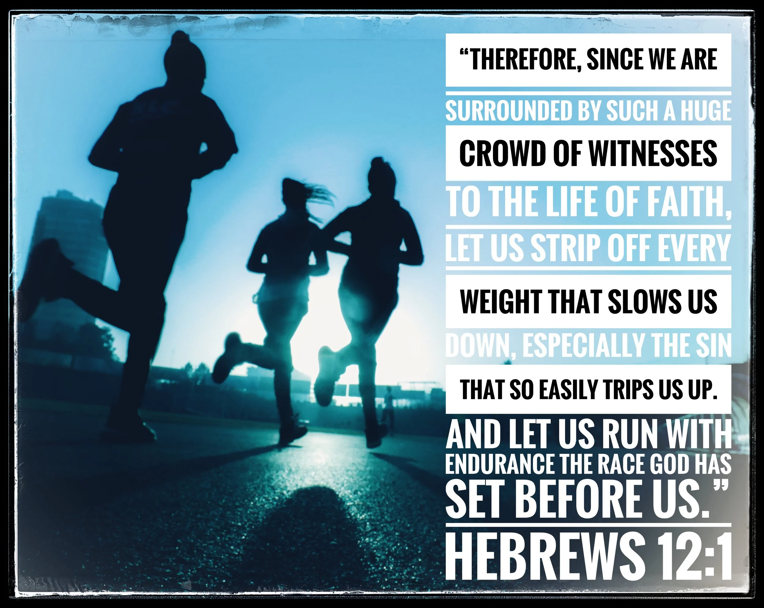 “Therefore, since we are surrounded by such a huge crowd of witnesses to the life of faith, let us strip off every weight that slows us down, especially the sin that so easily trips us up. And let us run with endurance the race God has set before us.”—Hebrews 12:1 (NLT)